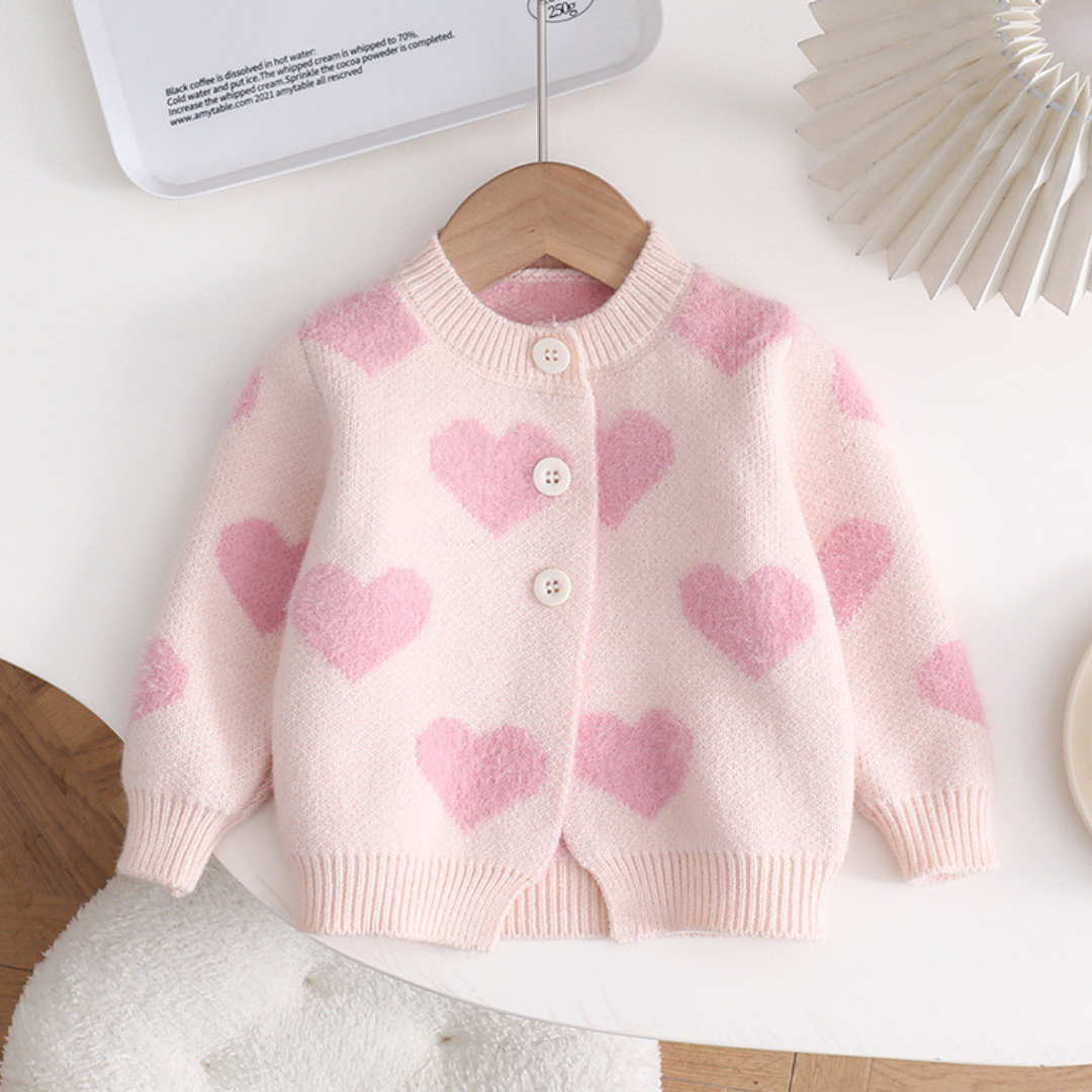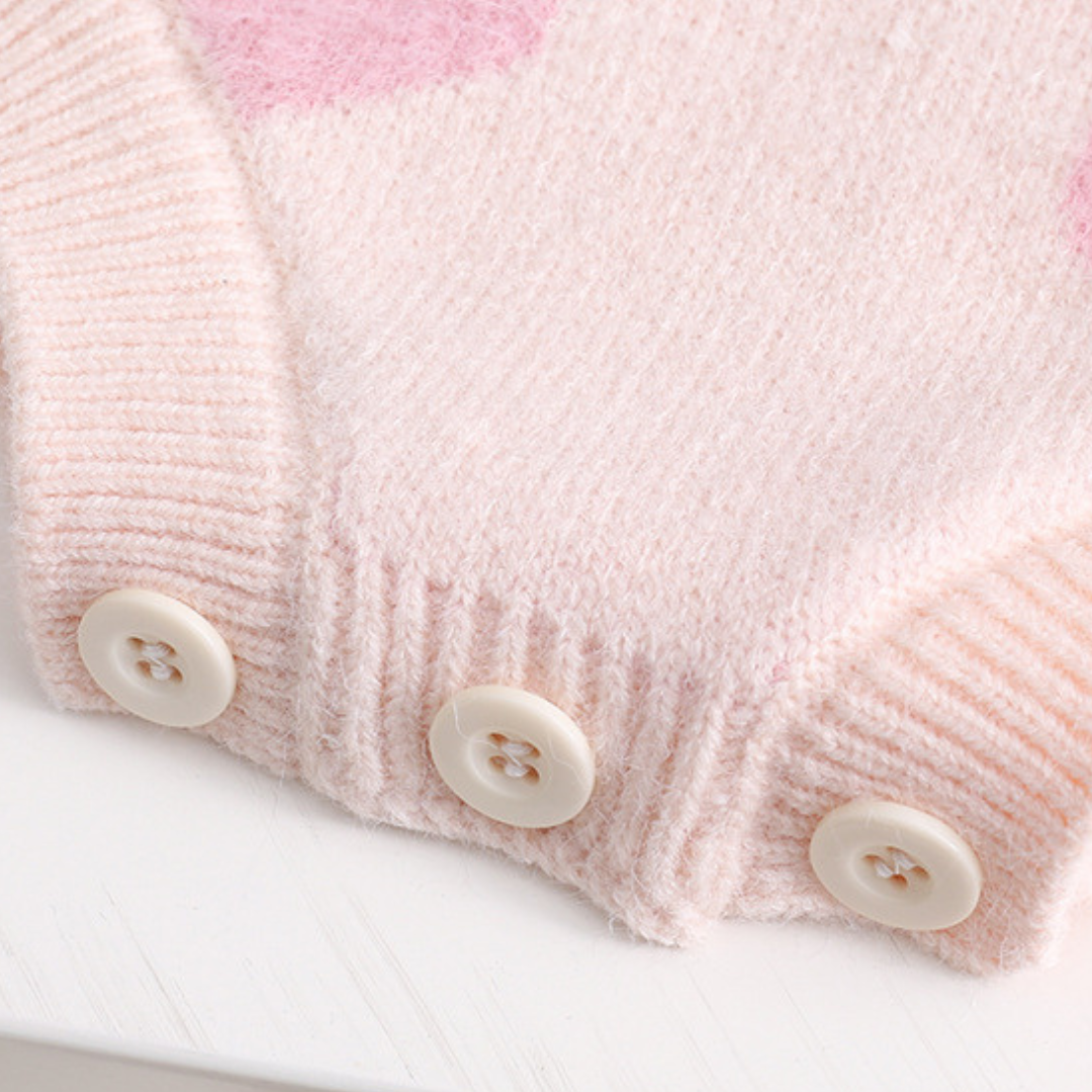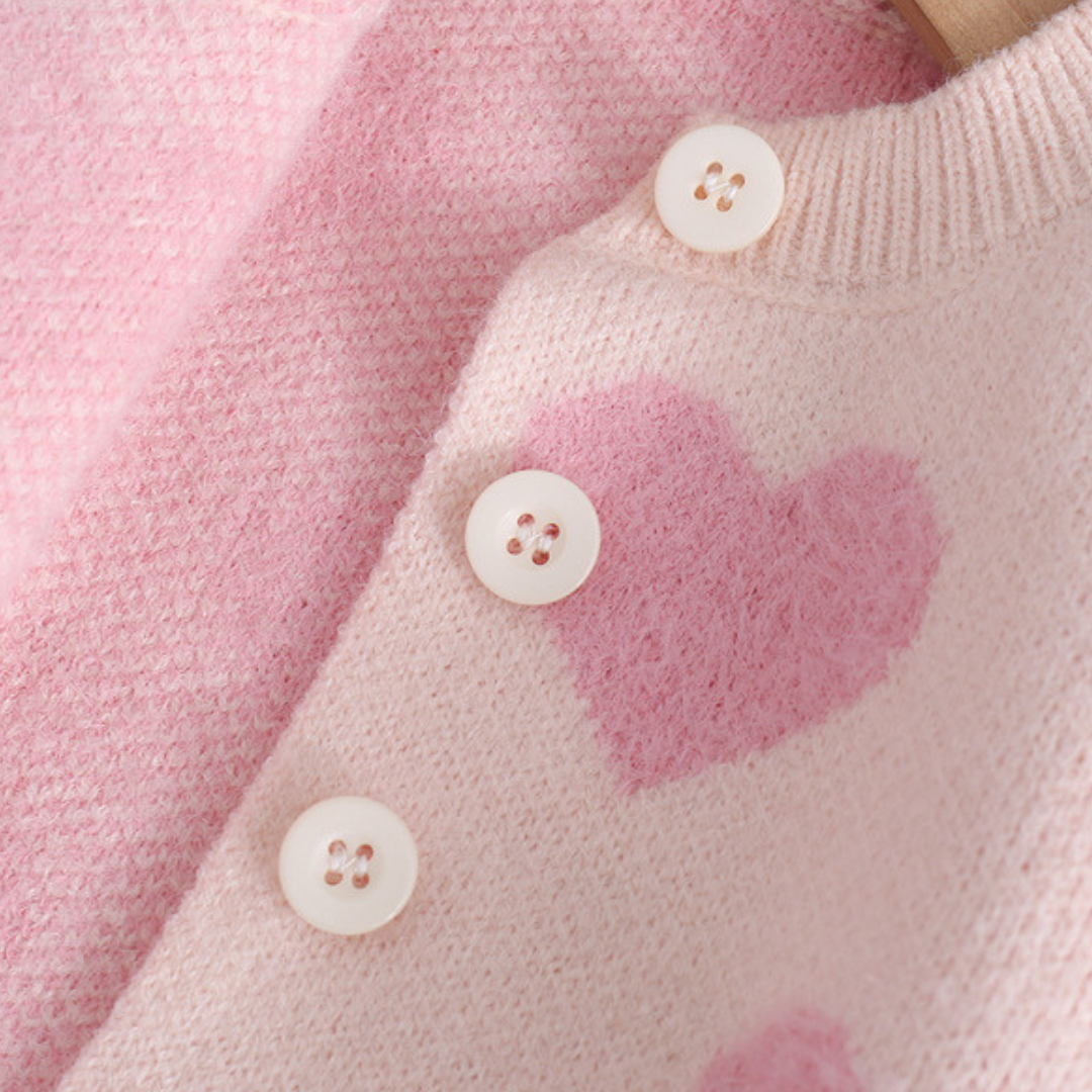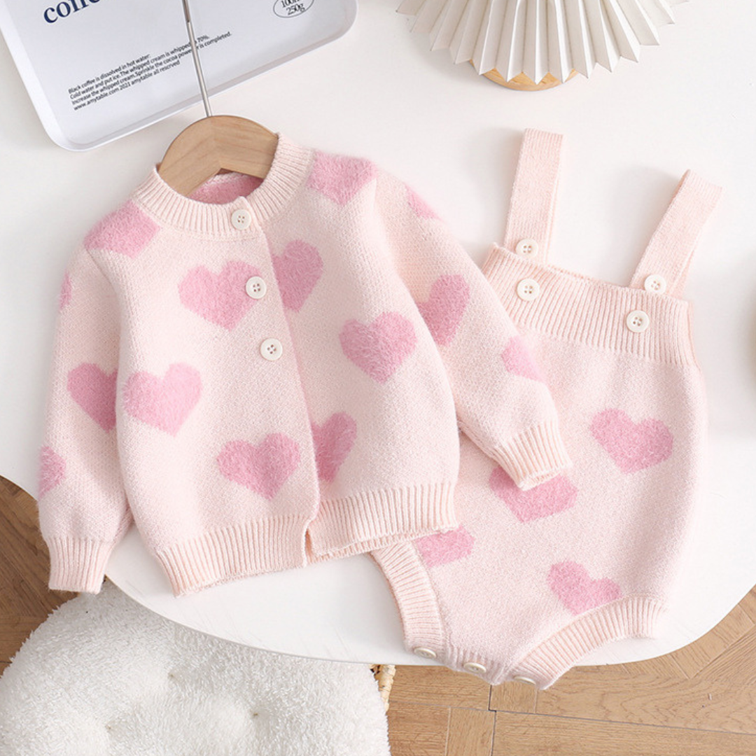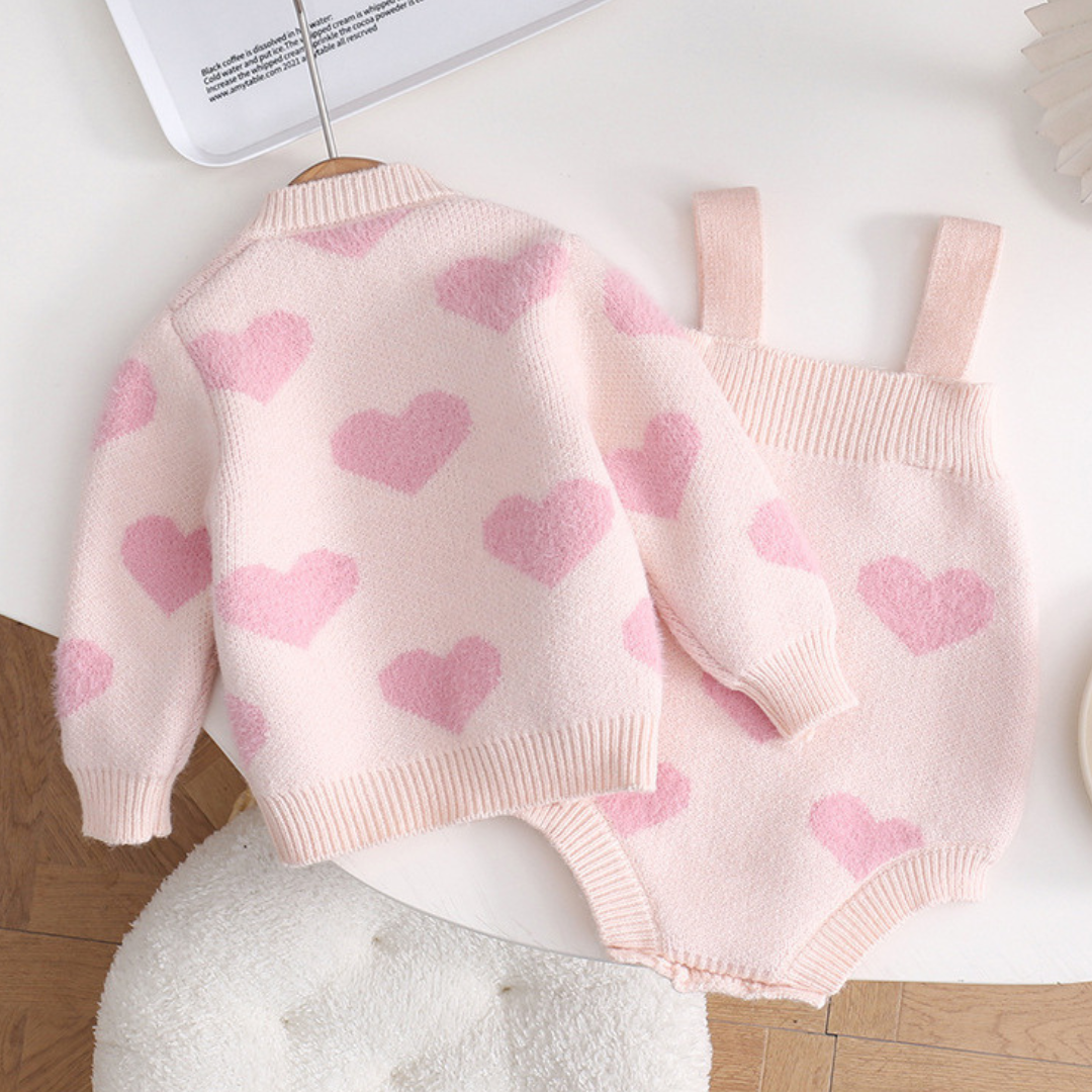 Meet Amora, an irresistibly soft knit set designed to keep your little one cozy and adorable all day long. Featuring a heart-patterned cardigan and matching romper, Amora brings warmth, comfort, and a touch of love to every outfit.