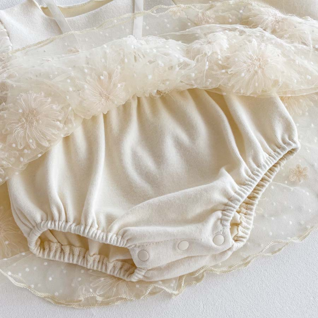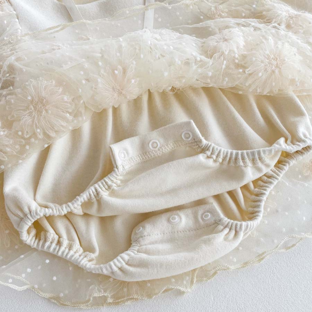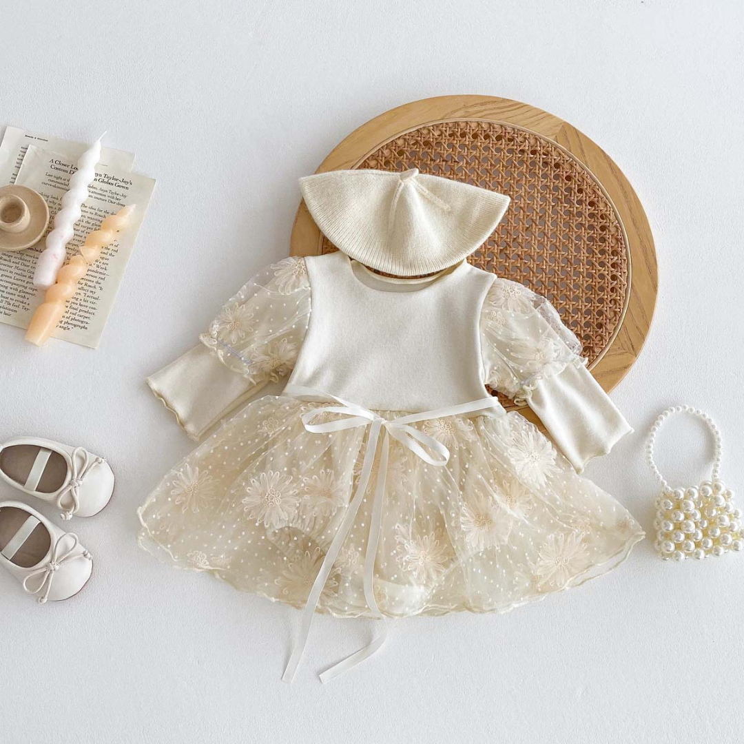 Meet Alba, a beautifully crafted dress designed for life’s most special occasions. With its soft knit bodice, delicate embroidered tulle skirt, and matching bonnet, Alba brings a timeless charm to your little one’s wardrobe.