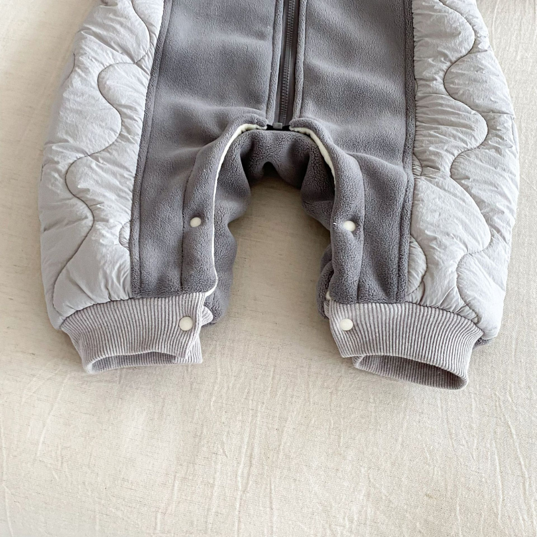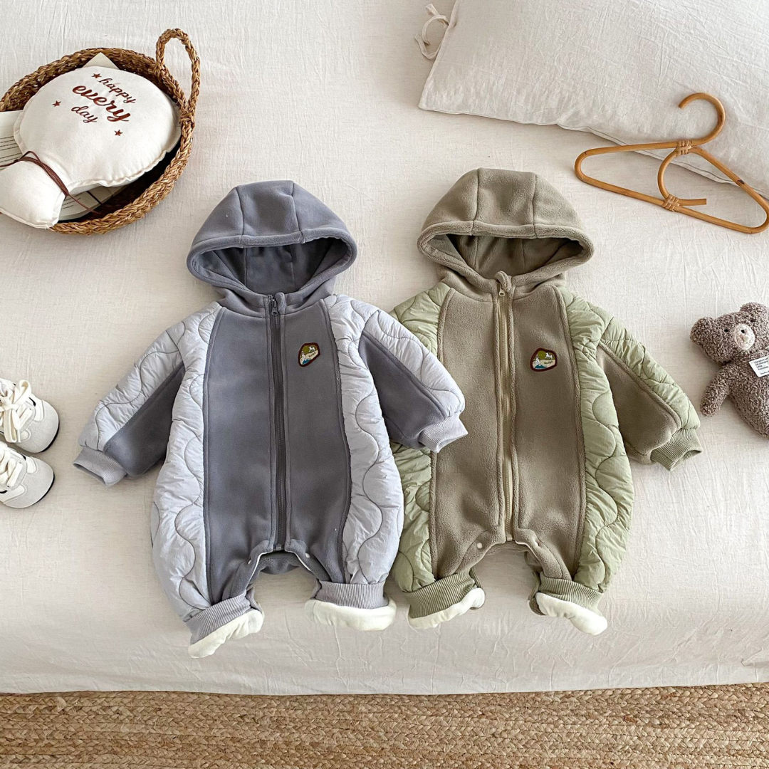 Meet Ezra, a warm and comfy hooded onesie designed to keep your baby snug on cooler days. With its soft fleece body and lightly padded panels, Ezra offers the perfect balance of warmth, comfort, and everyday practicality.